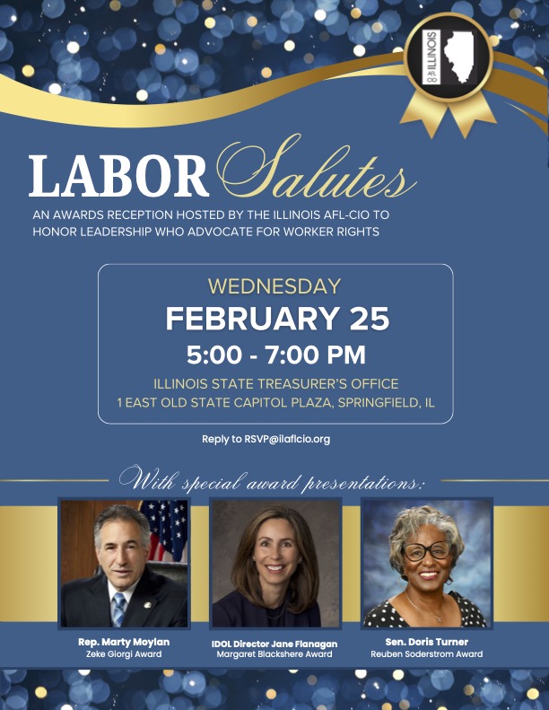 Our annual Labor Salutes reception is coming up on Wednesday, February 25 from 5-7pm. Join us in Springfield as we honor former State Representative Marty Moylan; Illinois Department of Labor Director, Jane Flanagan; and State Senator Doris Turner. #1u ... See MoreSee Less